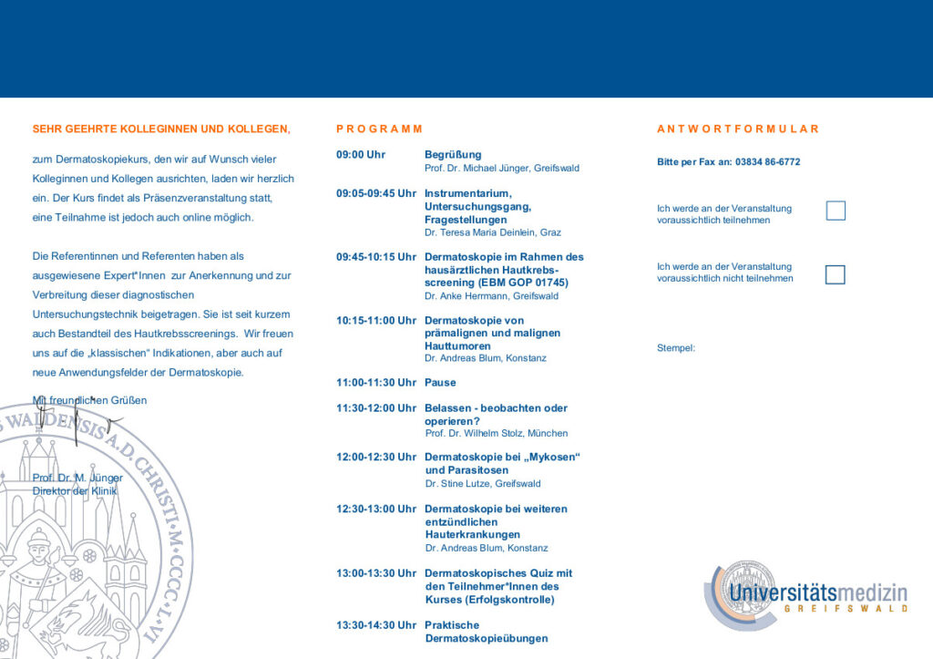Die Klinik und Poliklinik für Hautkrankheiten in Greifswald lädt herzlich zum Dermatoskopiekurs am 24.10.2020 ein. Die Veranstaltung beginnt um 9:00 Uhr und findet als Präsenzveranstaltung statt, eine Teilnahme ist jedoch auch online möglich. Der Link zum Live-Stream wird am Tag der Veranstaltung auf der Projektwebseite „TeleDermatologie“ veröffentlicht. Weitere Informationen zum Kurs mit dem kompletten Programm […]